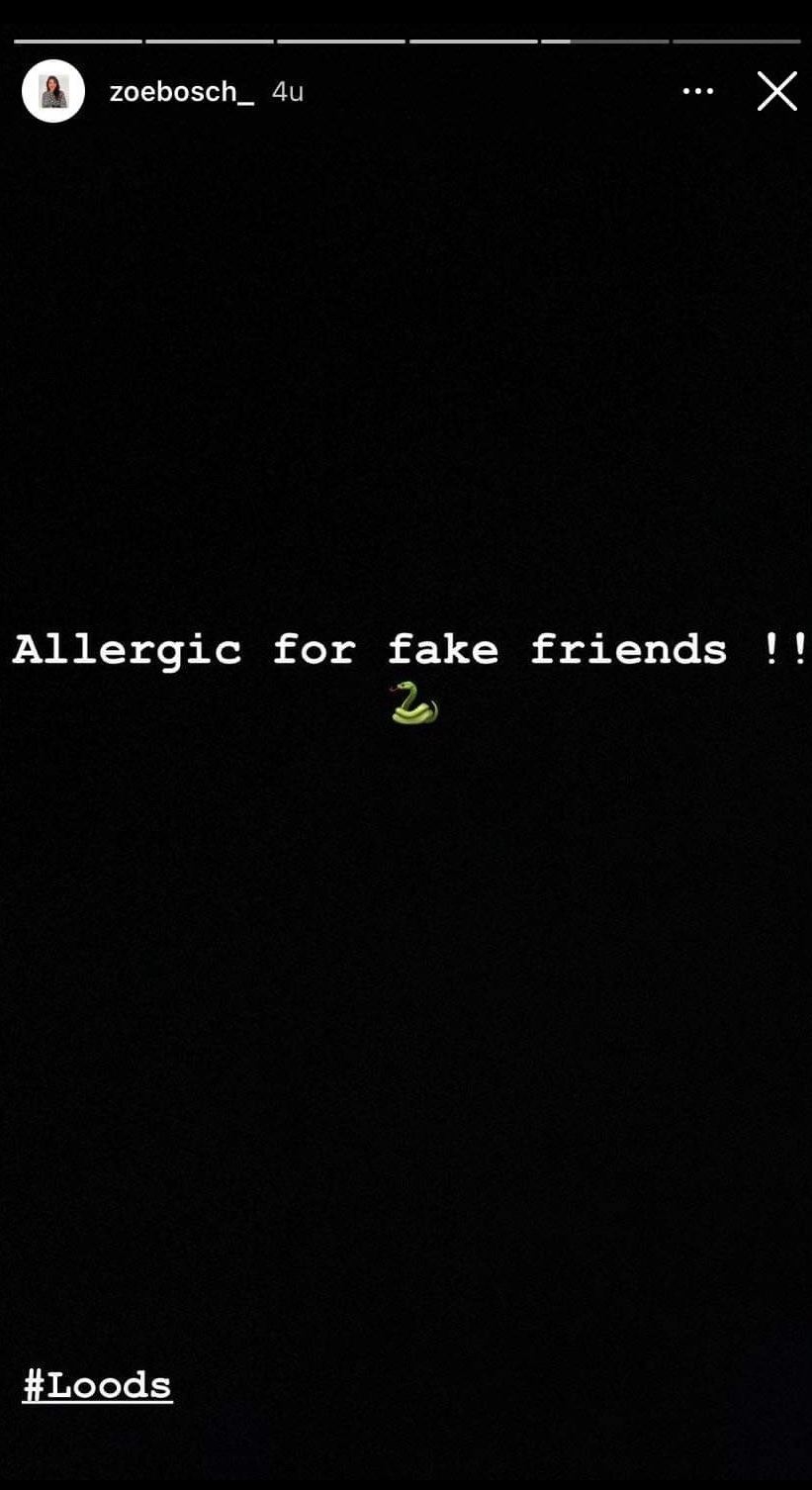 Op Instagram schrijft Zoë in haar Story nu namelijk: “Allergic for fake friends #loods”, vrij vertaald: ‘Allergisch voor neppe vrienden’. Getuige de hashtag ‘loods’ doelt ze dus duidelijk op bepaalde medekandidaten.