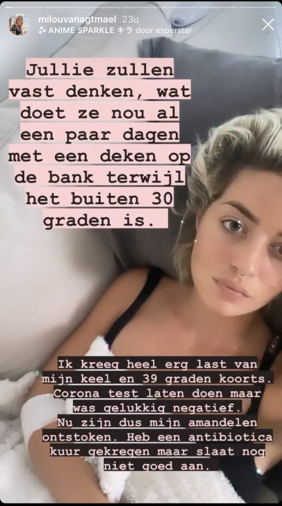 Op Instagram schrijft de blondine: “Jullie zullen vast denken: wat doet ze nou al een paar dagen met een deken op de bank terwijl het buiten 30 graden is? Ik kreeg heel erg last van mijn keel en 39 graden koorts. Coronatest gedaan, was gelukkig negatief. Nu zijn mijn amandelen ontstoken. Heb een antibioticakuur gekregen, maar die slaat nog niet goed aan.”